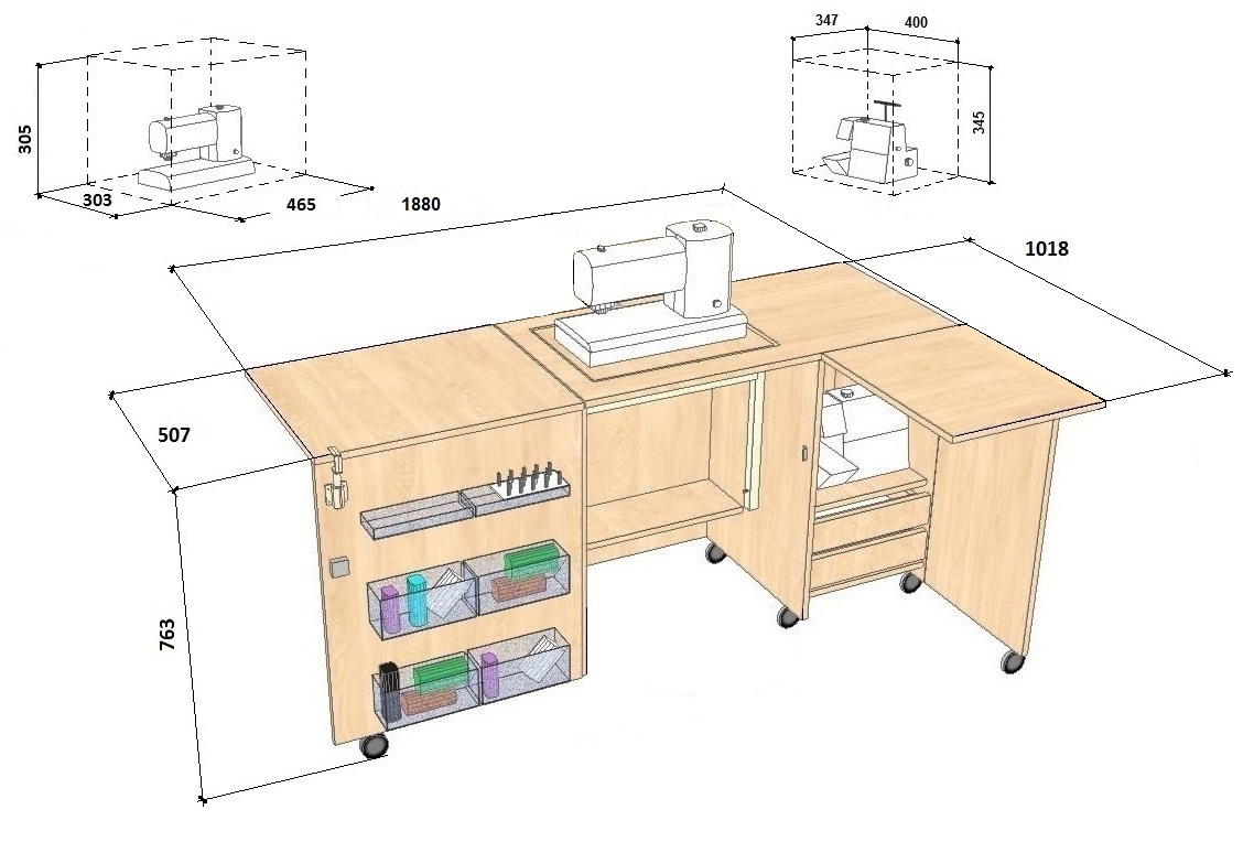Verwandeltischer Tisch für Nähgeräte mit einem Gewicht von bis zu 10 (15/20) kg.